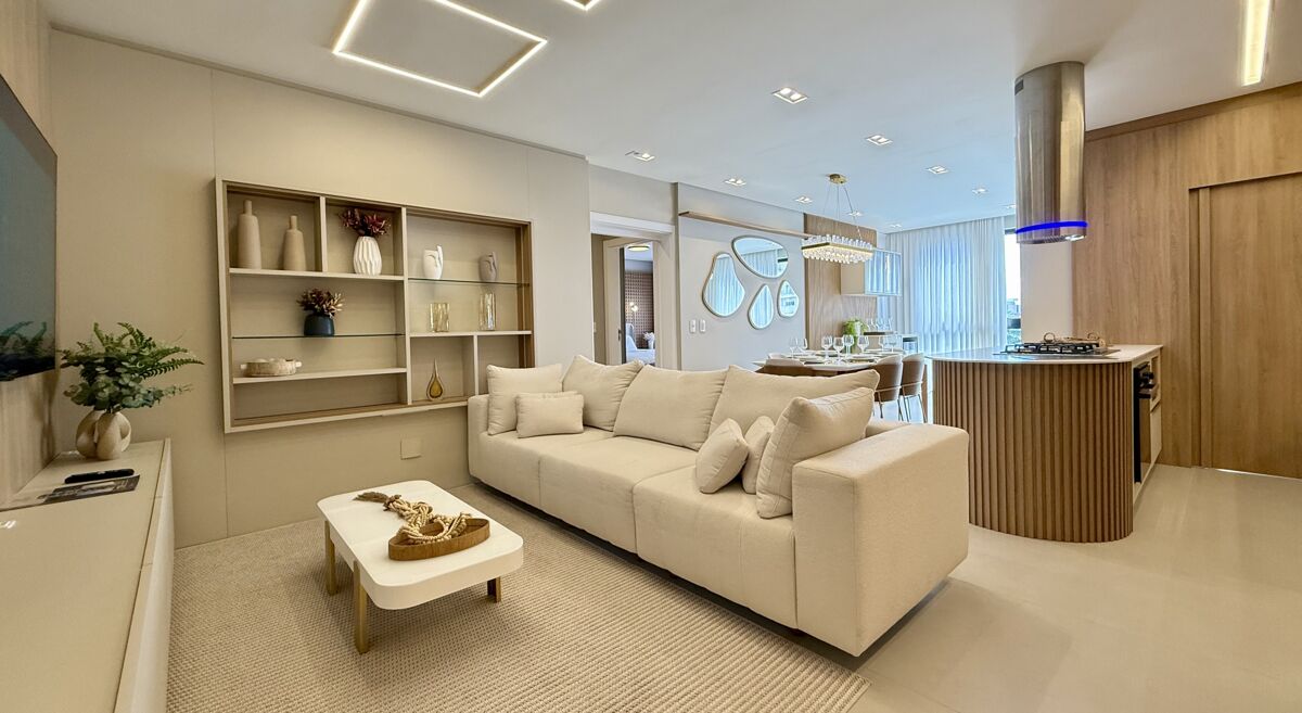 114m², 3 dormitórios (1 suíte + 2 demi-suítes), living integrado com churrasqueira a carvão, sacada em pele de vidro, lavabo, lavanderia, fechadura digital e persianas automatizadas.